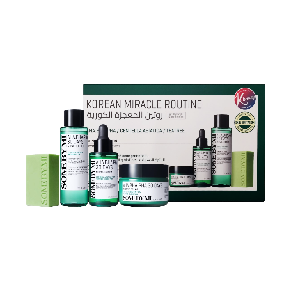 مجموعة المعجزة الكورية الأحجام الكبيرة اكبر 5 مرات ، روتين عناية كوري متكامل من منتجات المعجزة الكورية سوم باي مي للعناية بالبشرة المعرضة للحبوب وعلاج حبوب البشرة تحتوي على: